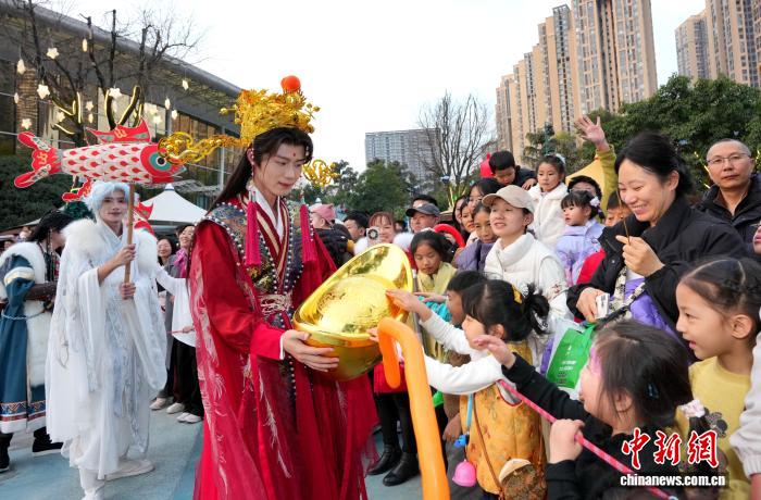 图为“财神”饰演者取搭客互动。中新社记者 安源 摄