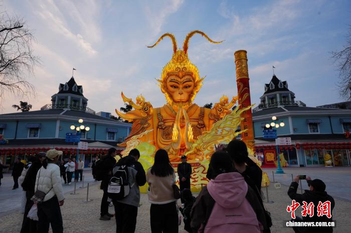 图为乘客正在“全天年夜圣”灯组前摄影纪念