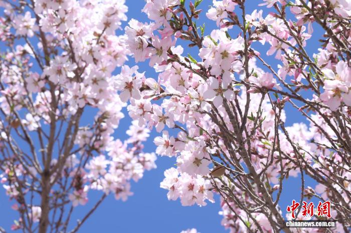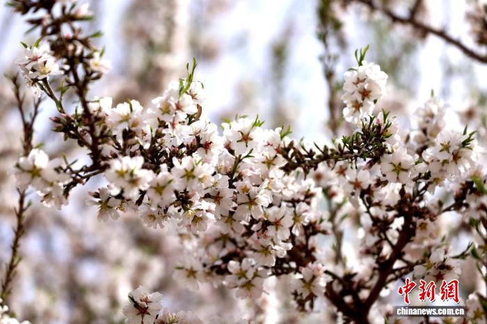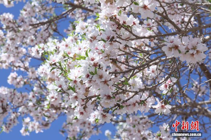 图为开放的巴旦木花缀谦枝端。韩亚伟 摄