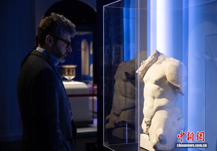 图为意年夜利任务职员正在专物馆内乱观光赫推克勒斯雕像。中新社记者 于晶 摄