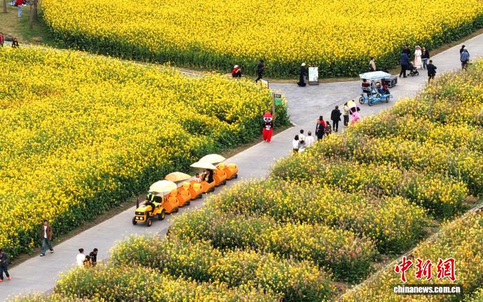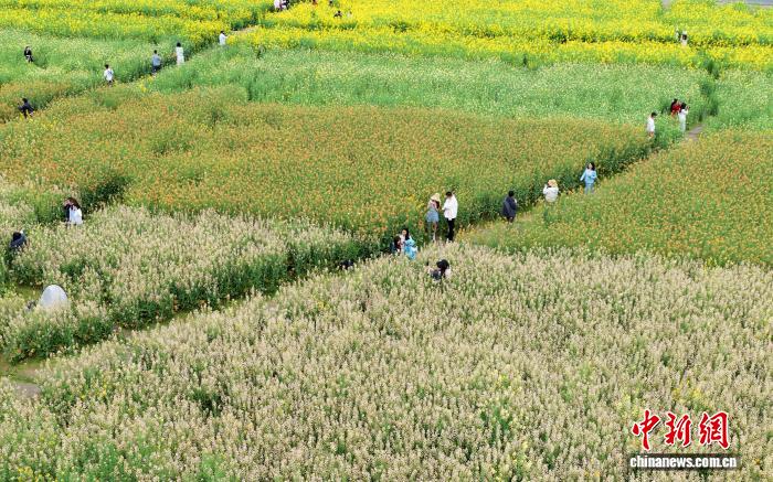 3月10日,位于4川省成城市新津区的华夏天府农业专览园里,黑色油菜花开放,布满着浓浓的秋意,吸收游人观光。图为乘客正在黑色油菜花田里顽耍。(无人机像片)中新社记者 安源 摄