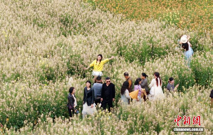3月10日,位于4川省成城市新津区的华夏天府农业专览园里,黑色油菜花开放,布满着浓浓的秋意,吸收游人观光。图为旅客正在黑色油菜花田里摄影。(无人机相片)中新社记者 安源 摄