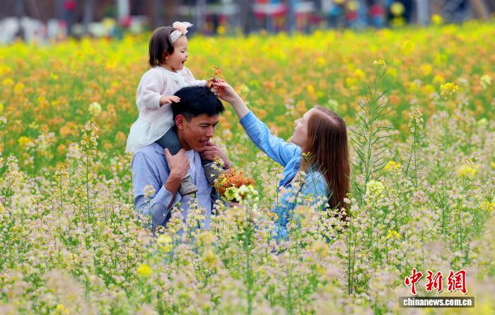 3月10日,位于4川省成都邑新津区的中原天府农业专览园里,黑色油菜花开放,布满着浓浓的秋意,吸收游人观光。图为中邦乘客正在黑色油菜花田里玩耍。中新社记者 安源 摄
