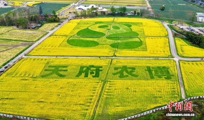 3月10日,位于4川省成都会新津区的华夏天府农业专览园里,黑色油菜花开放,布满着浓浓的秋意,吸收游人观光。图为华夏天府农业专览园里的黑色油菜花田。(无人机像片)中新社记者 安源 摄